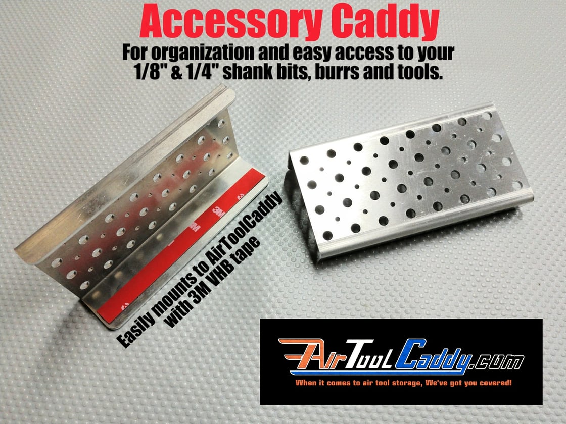 The Accessory Caddy will organize and provide easy access to all your commonly used 1/8" & 1/4" shank die grinder bits, burrs and discs.